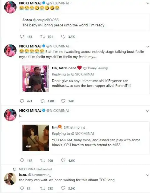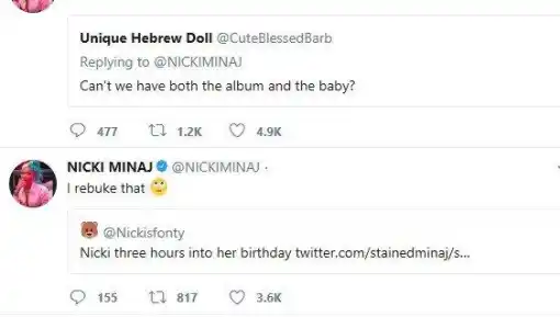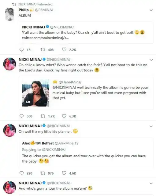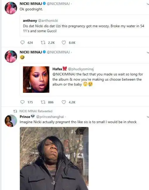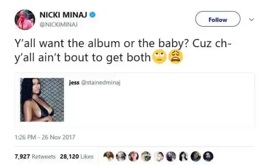 Rapper Nicki Minaj took to her Twitter page to ask her fans if they wanted a new album or a baby. Shortly after, she posted two photos of her rumoured boyfriend, Nas on her IG page. A fan shared the pregnant Nicki photo above, but Nicki rebuked it, lol.
